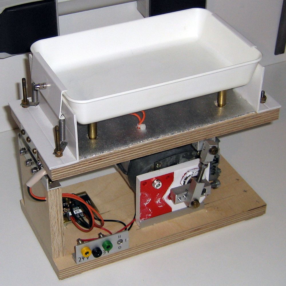 Bei meiner Suche nach einer saubereren Methode bin ich auf die Ätzmaschine von Jürgen Woetzel gestoßen. Diese Ätzmaschine verwendet eine flache, beheizte Schale, die zur Umwälzung des Ätzbades von einem Motor geschwenkt wird. Beim Ätzvorgang kommt nur die Schale mit der Lösung in Kontakt, so dass die Reinigung stark vereinfacht wird. Zudem kann die Ätzlösung bei jeder Benutzung neu angesetzt werden, da nur eine sehr geringe Menge benötigt wird. Damit werden Probleme durch verbrauchte Ätzlösung vermieden. Der Ätzmittelverbrauch ist trotzdem nicht nennenswert höher als beim Küvettenätzen. Aufgrund dieser Vorteile habe ich mich dazu entschieden, ein Ätzgerät nach dem oben genannten Vorbild zu bauen.